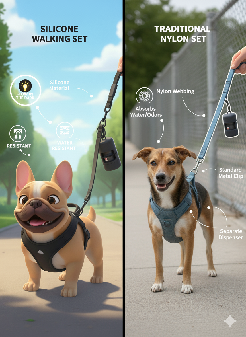 Elevate your daily strolls with our Silicone Walking Set, designed for durability and ease. Made from high-quality textured silicone, this set resists weather and is simple to clean, ensuring it stays fresh even after muddy adventures. The harness is available in multiple sizes for a perfect fit, complemented by a one-size-fits-all leash for convenience. Enjoy comfortable, reliable walks with your dog, no matter the conditions.
